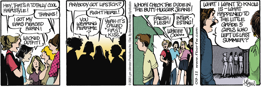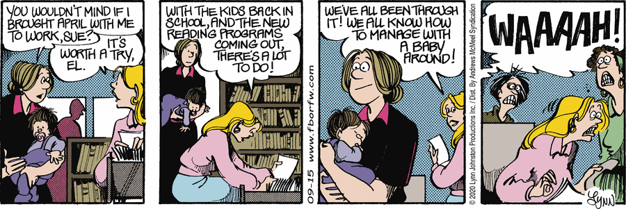 Lynn's Comments: This was so much fun to draw. When I look at this strip again, I remember drawing it in pencil and looking forward to tracing it with pen and ink. Feeling the bite of pen nib on paper and seeing the lines become the characters was like "bringing them to life." April (as a baby) and the dogs were an absolute joy to work on.