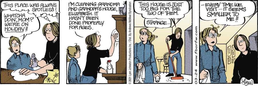 Lynn's Comments: Looking back on this strip, I had a hard time figuring out what Elizabeth was doing in the first panel here. She is stuffing her clothes into the washing machine. When I work with students, I always tell them to make sure the audience knows what they are looking at, that they use good reference so that appliances and machinery look right. Here, it seems, I didn't follow my own advice!