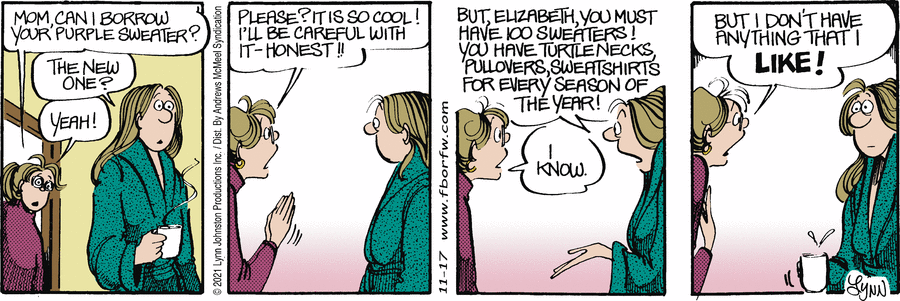 Lynn's Comments: In every panel here, I wanted to show Elly doing what moms do when they have a little one to care for. There is movement and action going on all the time. I have rarely done a strip where "talking head"” carry the gag forward. I wanted to show what real life is like.