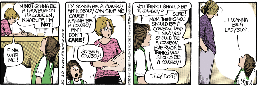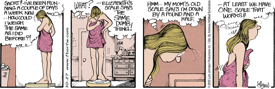 Lynn's Comments: I did this strip to address the readers who insisted I change Elly’s hairstyle. As one of the main characters in the strip, I felt I had to keep her looking relatively the same. Over the years, she sported a pony tail, a bun, and at one time, I "gave" her a perm. Still, the part-in-the-middle-and-tied -back-look was her signature and I didn't want to alter it. The frump-look was firm. This strip let the critics know that I was aware of their hatred for the hairstyle...but I wasn't about to change it!