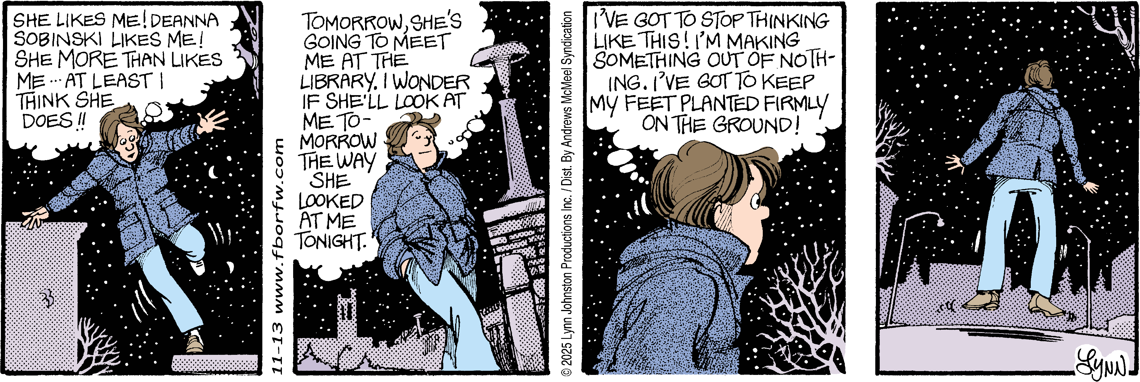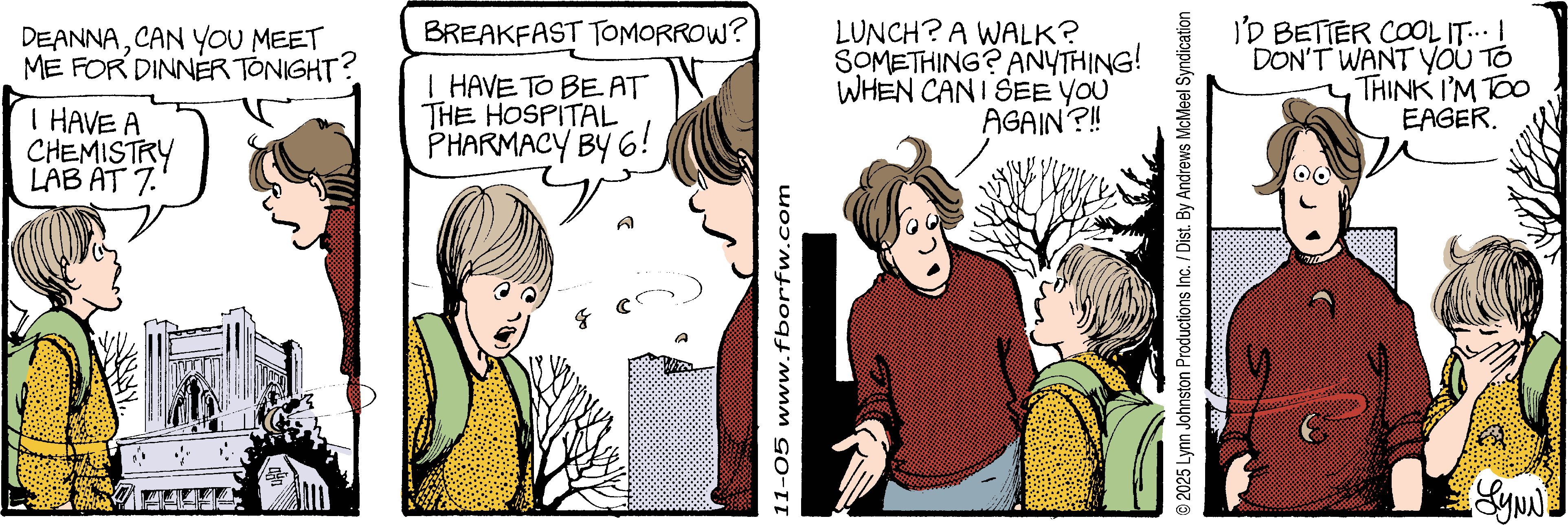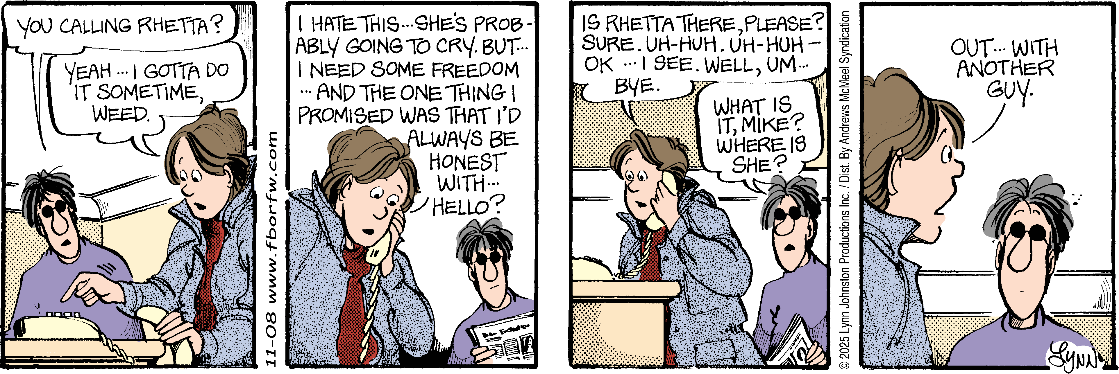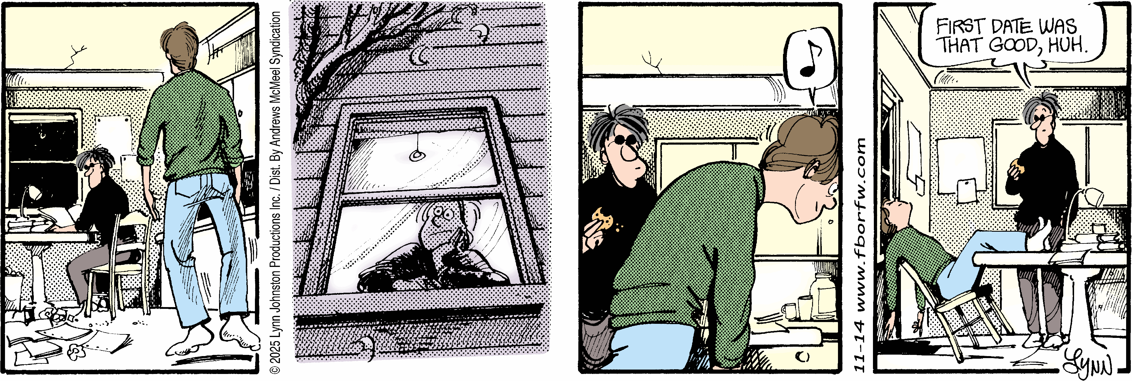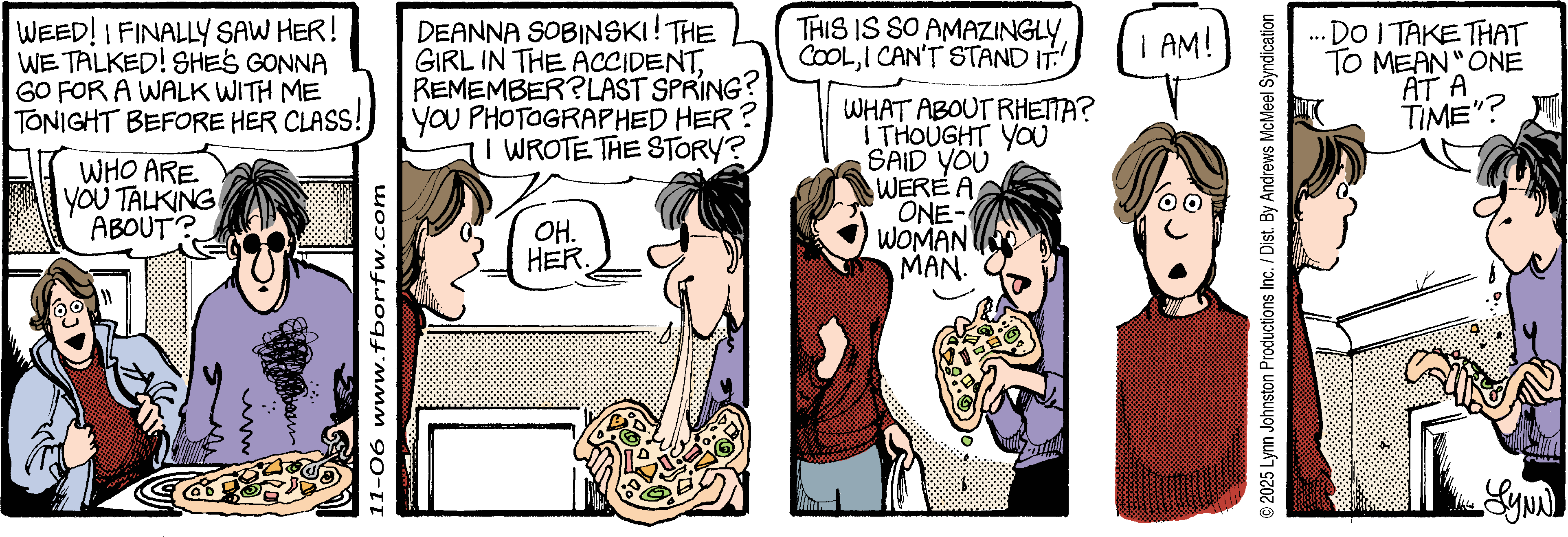 Lynn's Comments: This strip could have been done with just talking heads. But…drawing Weed eating a pizza without cutting it was so much fun. He is also reheating it on top of the stove elements without a pan under it. This is the kind of stuff my favourite cartoonists taught me: if you can, give the reader something other than the dialogue to think about.