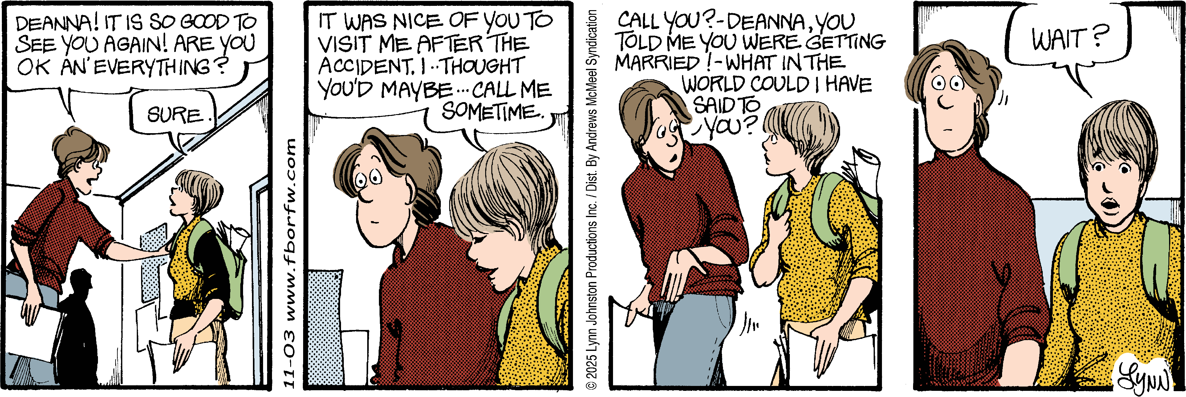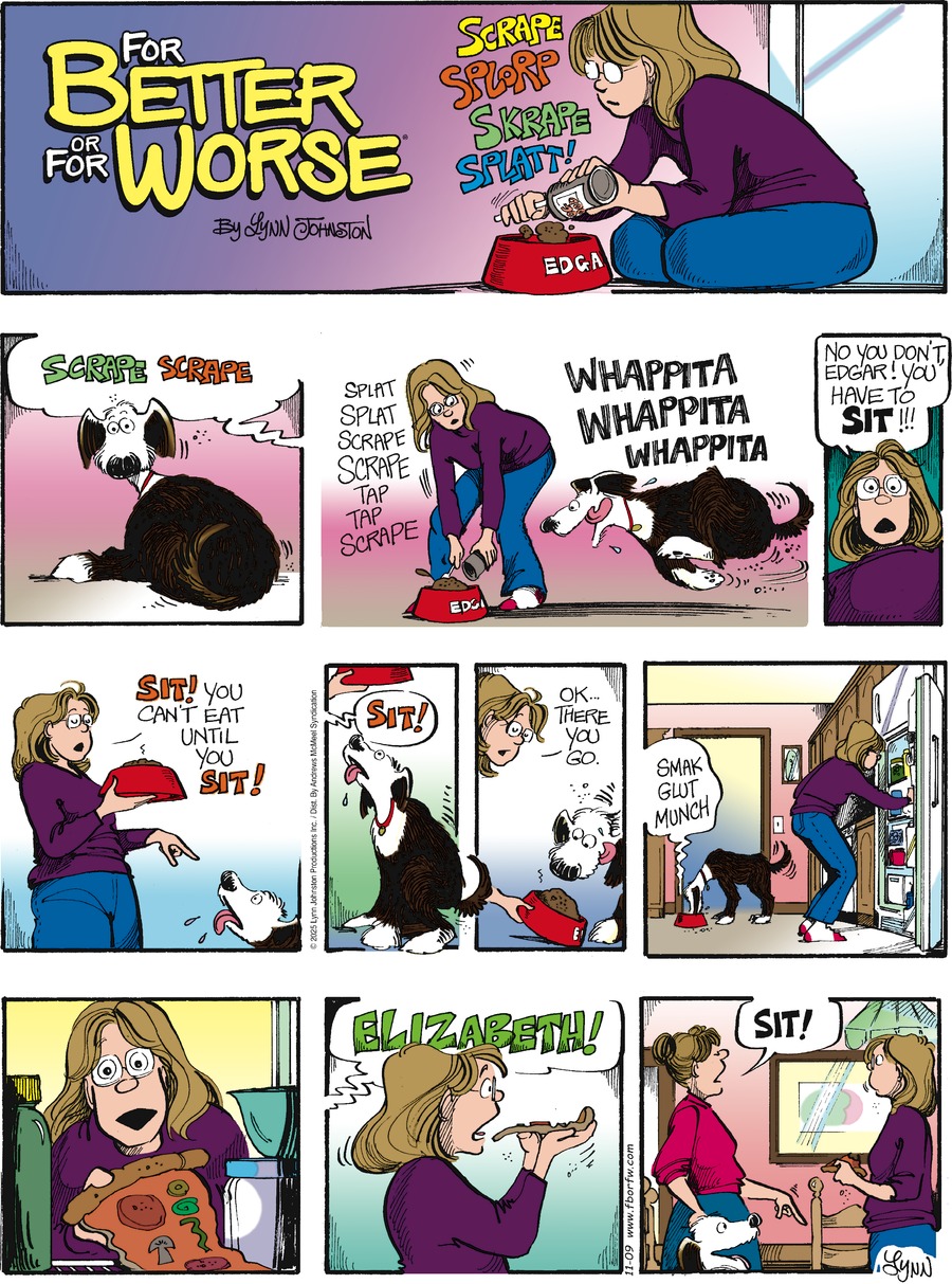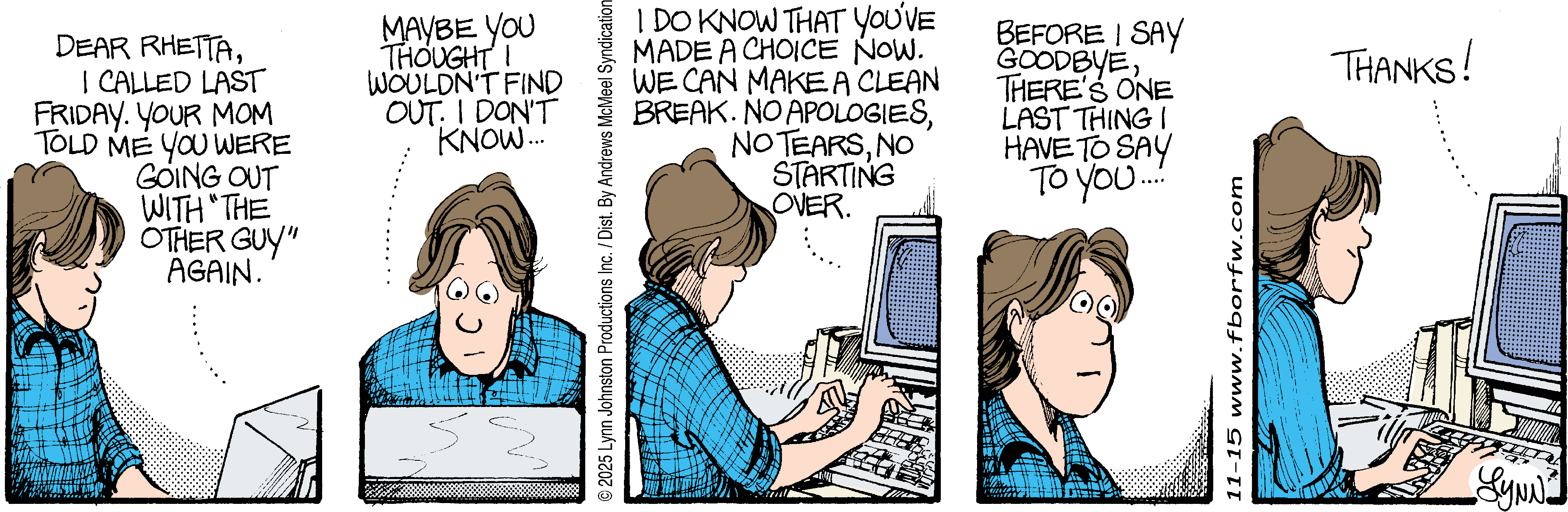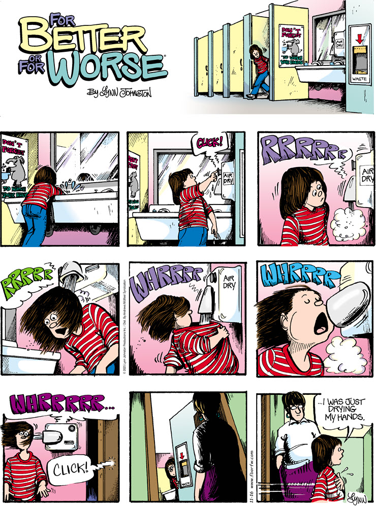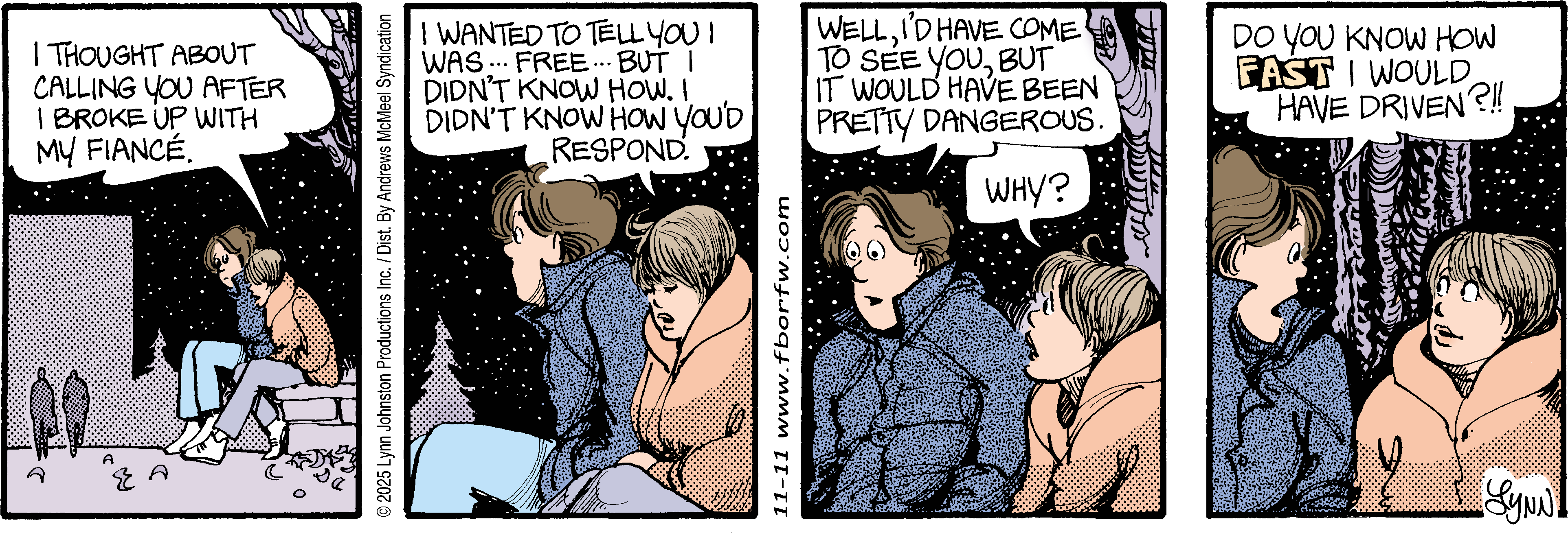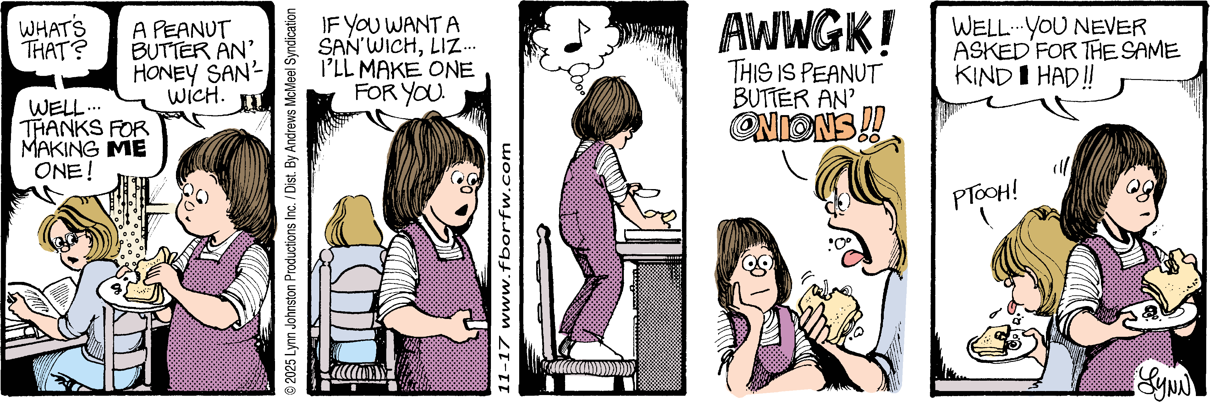 Lynn's Comments: This strip could have been done with just talking heads. But…drawing Weed eating a pizza without cutting it was so much fun. He is also reheating it on top of the stove elements without a pan under it. This is the kind of stuff my favourite cartoonists taught me: if you can, give the reader something other than the dialogue to think about.