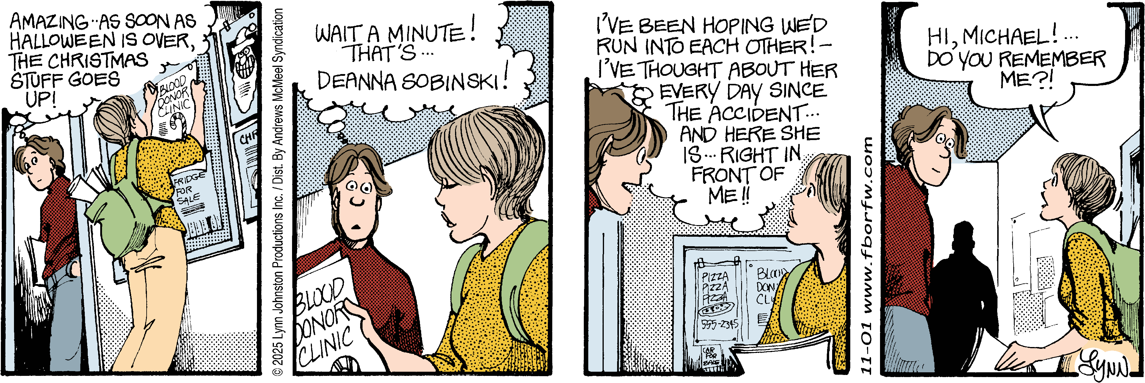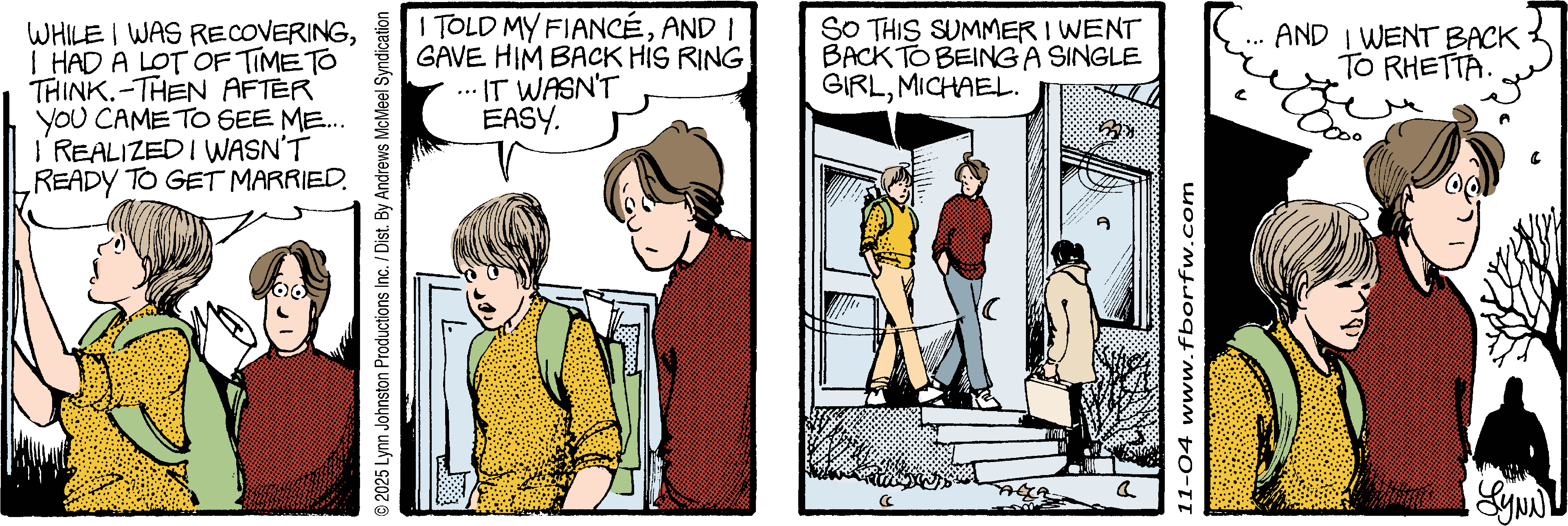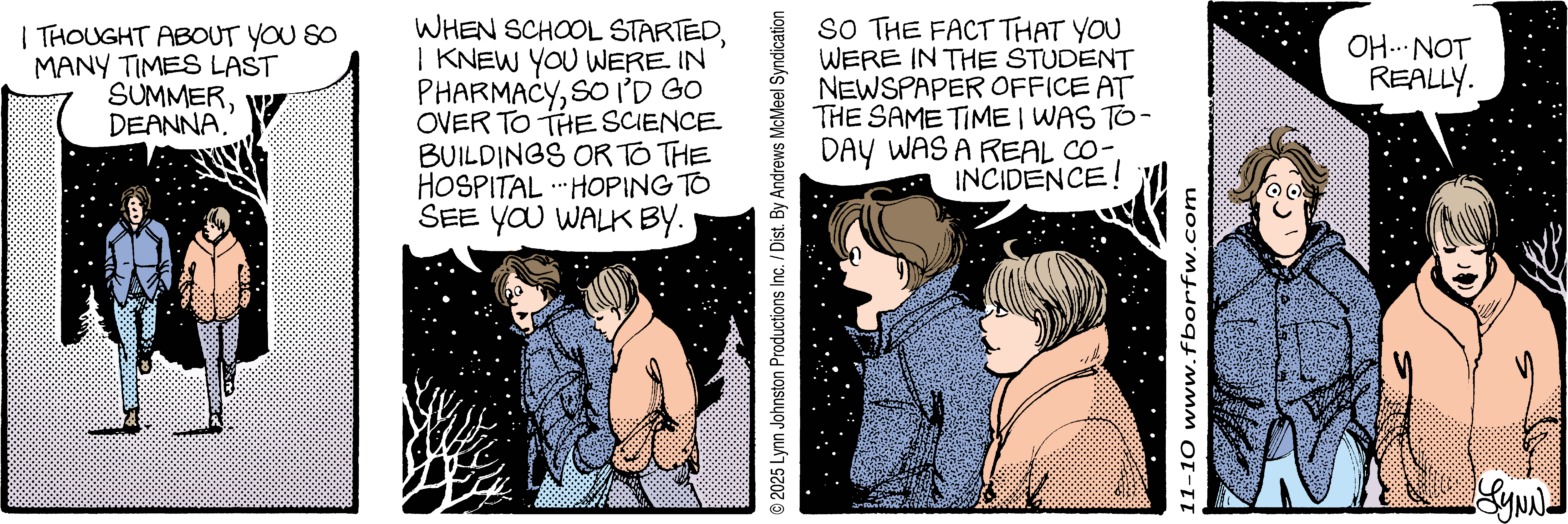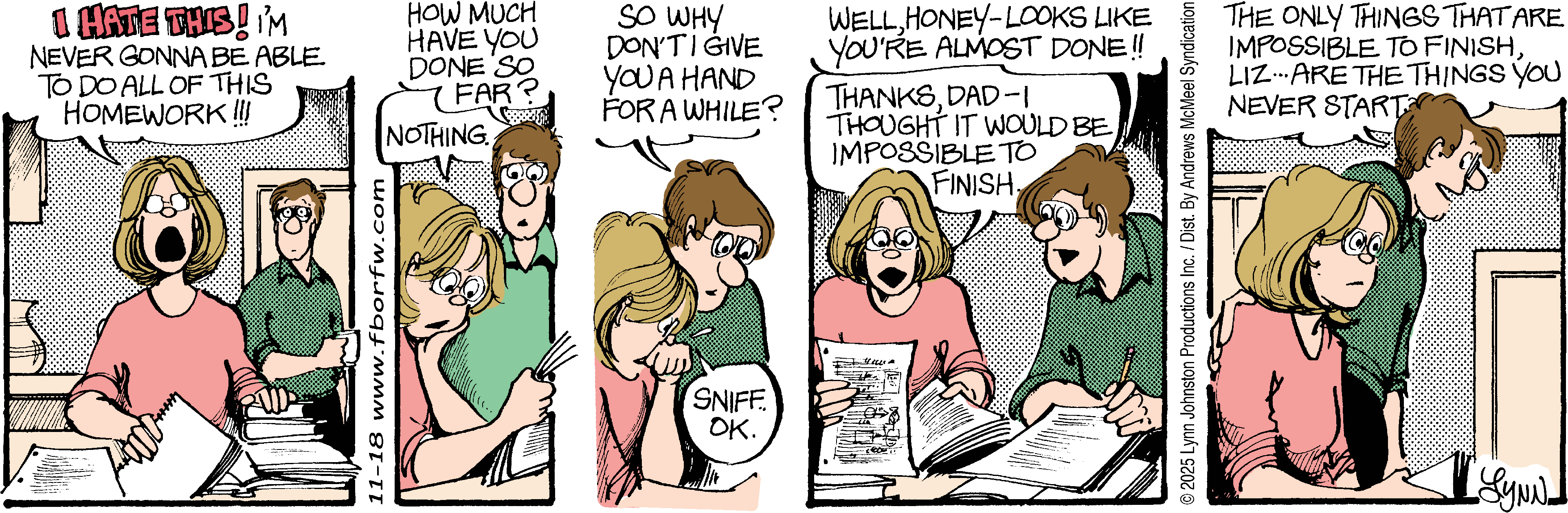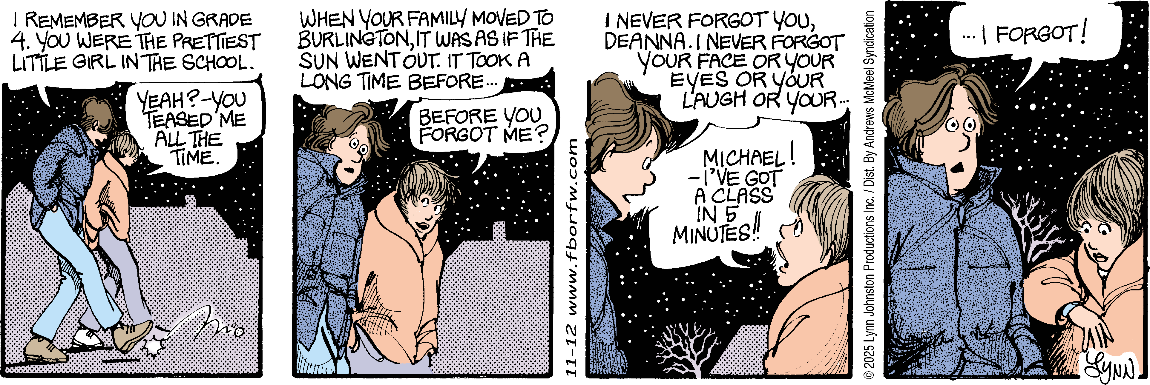 Lynn's Comments: This strip could have been done with just talking heads. But…drawing Weed eating a pizza without cutting it was so much fun. He is also reheating it on top of the stove elements without a pan under it. This is the kind of stuff my favourite cartoonists taught me: if you can, give the reader something other than the dialogue to think about.